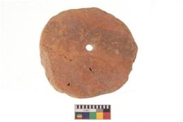 | Description / विवरण | Specimen of terracotta Wheel. It is red ware rounded shape with center perforation. |