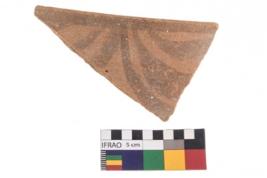 | Description / विवरण | The potsherd is decorated with two horizontal bands, one on the rim and other on the body, while between them are set of triple aches. |