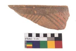 | Description / विवरण | Specimen of potsherd black on red painted pottery. It is fine fabric in sharp contrast with painted design are executed in black pigment. |