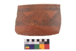 | Description / विवरण | Specimen of potsherd with black decorative geometric diamond set broad horizontal bands painting . |