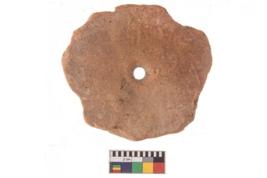 | Description / विवरण | Specimen of terracotta Wheel. It is red ware rounded shape with center perforation. |