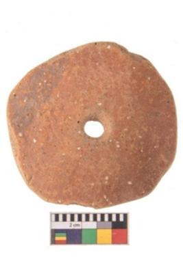 | Description / विवरण | Specimen of terracotta Wheel. It is red ware rounded shape with center perforation. |
