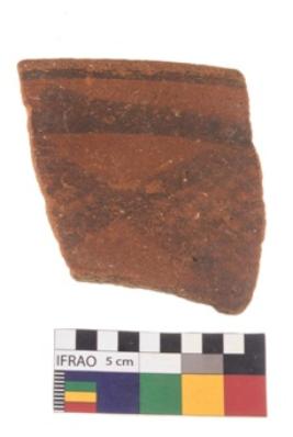 | Description / विवरण | Specimen of potsherd with black decorative geometric diamond set broad horizontal bands painting. |