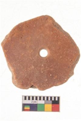 | Description / विवरण | Specimen of terracotta Wheel. It is red ware rounded shape with center perforation. |