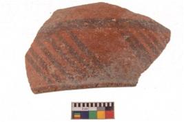 | Description / विवरण | Specimen of potsherd black on red painted pottery. It is fine fabric in sharp contrast with painted design are executed in black pigment. |