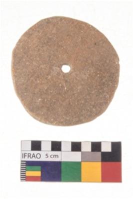 | Description / विवरण | Specimen of terracotta Wheel. It is red ware rounded shape with center perforation. |