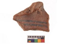 | Description / विवरण | Specimen of potsherd black on red painted pottery. It is fine fabric in sharp contrast with painted design are executed in black pigment. |