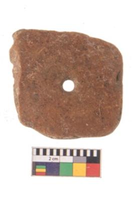 | Description / विवरण | Specimen of terracotta Wheel. It is red ware rounded shape with center perforation. |