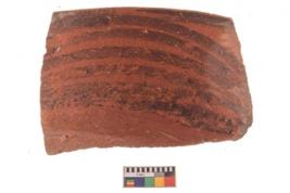 | Description / विवरण | Specimen of potsherd black on red painted pottery. It is fine fabric in sharp contrast with painted design are executed in black pigment. |