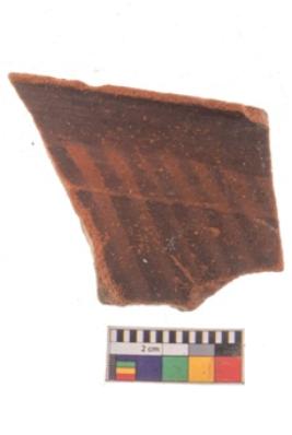 | Description / विवरण | Specimen of potsherd black on red painted pottery. It is fine fabric in sharp contrast with painted design are executed in black pigment. |