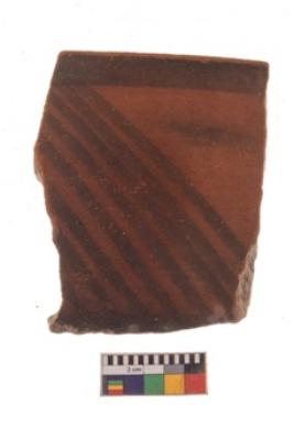 | Description / विवरण | Specimen of potsherd black on red painted pottery. It is fine fabric in sharp contrast with painted design are executed in black pigment. |