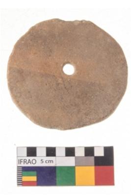 | Description / विवरण | Specimen of terracotta Wheel. It is red ware rounded shape with center perforation. |