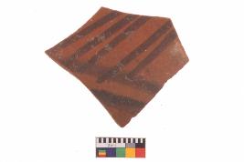 | Description / विवरण | Specimen of potsherd with black decorative geometric Linear painting, Tpre Black on Red Ware . |