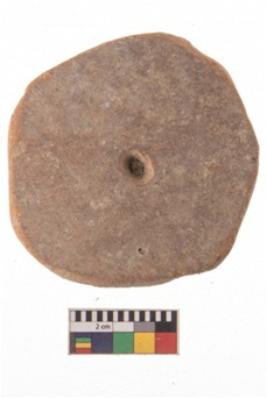 | Description / विवरण | Specimen of terracotta Wheel. It is red ware rounded shape with center perforation. |