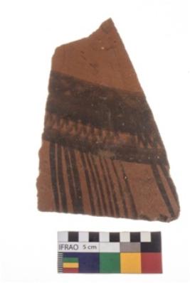 | Description / विवरण | Specimen of potsherd black on red painted pottery. It is fine fabric in sharp contrast with painted design are executed in black pigment. |