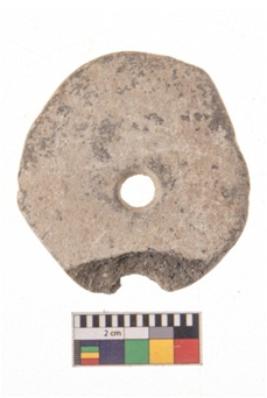 | Description / विवरण | Specimen of terracotta Wheel. It is red ware rounded shape with center perforation. |