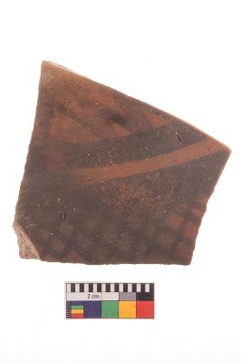 | Description / विवरण | Specimen of potsherd with black decorative geometric Net Pattern painting, Tpre Black on Red Ware . |
