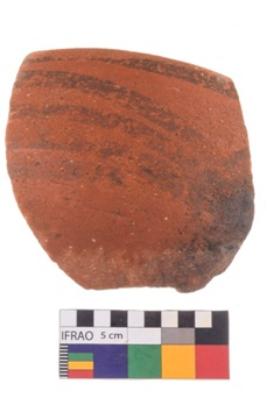 | Description / विवरण | Specimen of potsherd black on red painted pottery. It is fine fabric in sharp contrast with painted design are executed in black pigment. |