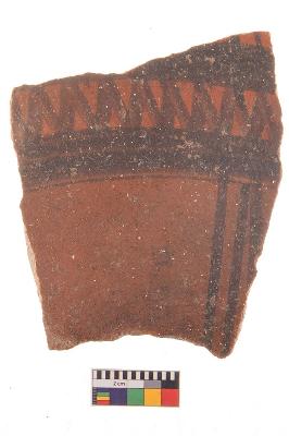 | Description / विवरण | Specimen of potsherd with black decorative geometric Set of two zigzag bands painting, Tpre Black on Red Ware . |