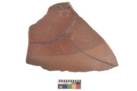 | Description / विवरण | Specimen of black on red ware with decorative geometric cross and parallel lines painting. |