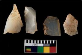 | Description / विवरण | There are n 4 of utilized worked cores. They show multidirectional irregular dominant scar pattern. Two are tapering on one end and have sharp edges. |