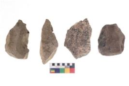 | Description / विवरण | These are n 4 of worked tools. They are tapering at one end and have sharp edges. They have round base and show dominant irregular scar pattern. |