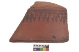 | Description / विवरण | Specimen of black on red ware with decorative geometric a row of arches over a horizontal band painting. |
