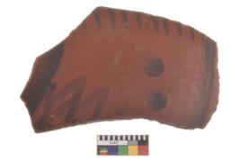 | Description / विवरण | Specimen of black on red ware with decorative geometric a row of arches and two dots over a horizontal band painting. |