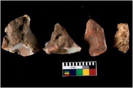 | Description / विवरण | There are n 4 of utilized worked cores. They show multidirectional irregular dominant scar pattern. Two have flat base. |