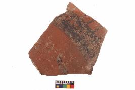| Description / विवरण | Specimen of potsherd with black decorative geometric Linear painting, Tpre Black on Red Ware . |