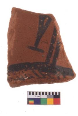 | Description / विवरण | Specimen of potsherd black on red painted pottery. It is fine fabric in sharp contrast with painted design are executed in black pigment. |