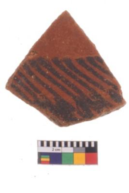 | Description / विवरण | Specimen of potsherd black on red painted pottery. It is fine fabric in sharp contrast with painted design are executed in black pigment. |