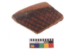| Description / विवरण | Specimen of potsherd with black decorative geometric Net Pattern painting . |