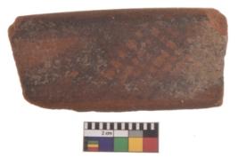 | Description / विवरण | Specimen of black on red ware with decorative geometric two horizontal bands containing criss-cross pattern painting. |