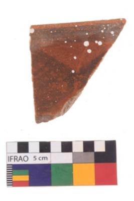 | Description / विवरण | Specimen of potsherd with black decorative geometric diamond set broad horizontal bands painting. |