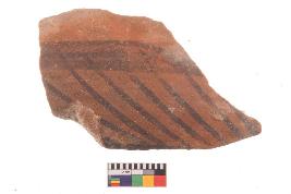 | Description / विवरण | Specimen of potsherd with black decorative geometric Linear painting, Tpre Black on Red Ware . |