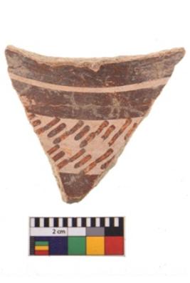 | Description / विवरण | Specimen of potsherd with decorative geometric painting. Type Black on Red Ware . |