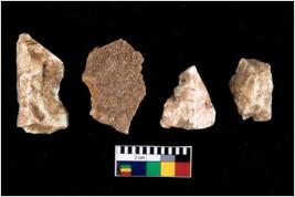 | Description / विवरण | There are n 4 of utilized worked cores. They show multidirectional irregular dominant scar pattern. Two are tapering at one end, all are having blunt edges. |