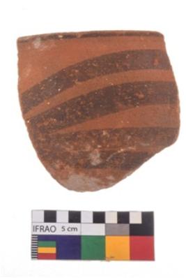 | Description / विवरण | The potsherd is decorated with two horizontal bands, one on the rim and other on the body, while between them are set of triple aches. |