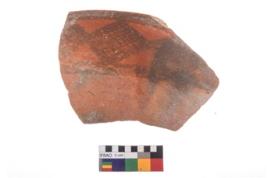 | Description / विवरण | Specimen of potsherd with black decorative geometric diamond set broad horizontal bands painting. |