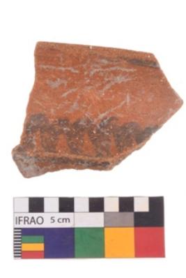 | Description / विवरण | Specimen of potsherd black on red painted pottery. It is fine fabric in sharp contrast with painted design are executed in black pigment. |