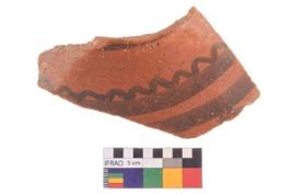 | Description / विवरण | Specimen of potsherd black on red painted pottery. It is fine fabric in sharp contrast with painted design are executed in black pigment. |