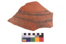 | Description / विवरण | Specimen of potsherd black on red painted pottery. It is fine fabric in sharp contrast with painted design are executed in black pigment. |