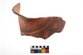 | Description / विवरण | Specimen of potsherd with black decorative geometric diamond set broad horizontal bands painting. |