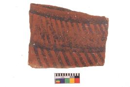 | Description / विवरण | Specimen of potsherd with black decorative geometric Linear painting, Type Black on Red Ware . |