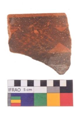 | Description / विवरण | Specimen of potsherd with black decorative geometric diamond set broad horizontal bands painting . |