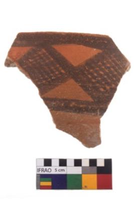 | Description / विवरण | Specimen of potsherd with black decorative geometric diamond set broad horizontal bands painting.. |