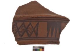 | Description / विवरण | Specimen of black on red ware with decorative geometric pattern of diamonds filled in with dots, flanked by a triangle filled with dots, and group of four solid elongated traingles painting. |