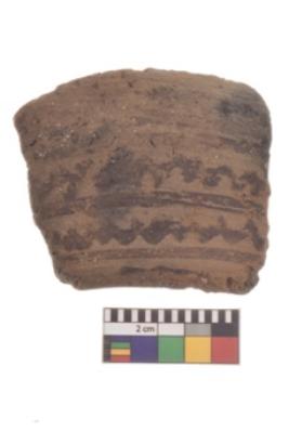 | Description / विवरण | Specimen of black on red ware with decorative geometric horiontal zig-zag in two registers between bands painting. |