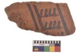 | Description / विवरण | Specimen of black on red ware with decorative geometric groups of double horizontal lines enclosing a pattern of vertical lines with strokes at right angles to left painting. |